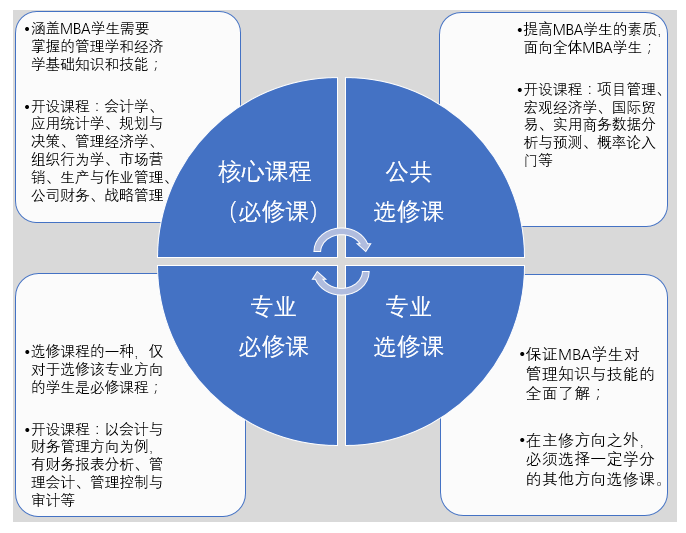 3、MBA课程内容涉及管理类、经济学类、金融、财务、法律等等,能力训练不光讲究组织、领导才能,也涉及以口才为依托的沟通能力、把握全局、进行敏锐思考、判断和处理问题的能力。